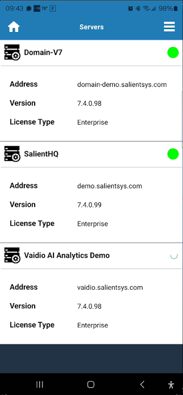 Apl CompleteView(TM) Salient membolehkan anda menyambung dengan mudah ke penggunaan V7.x anda dan mengakses video langsung, main semula dan mengeksport video yang dirakam serta mengawal kamera dengan fungsi PTZ dari telefon anda dengan serta-merta.