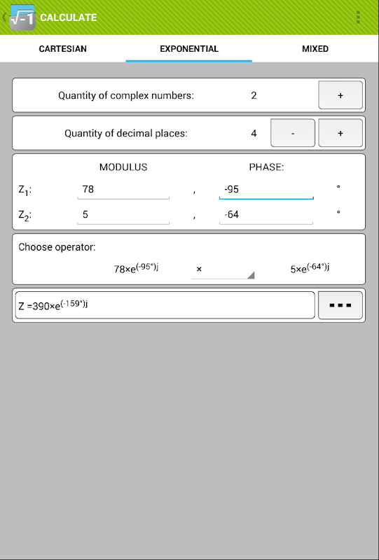 Permohonan ini menawarkan kemungkinan untuk mudah mengira nombor kompleks dan menunjukkan langkah-langkah untuk berbuat demikian