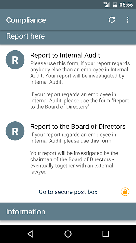 The app also acts as a whistleblowing portal, letting you report whistleblowing concerns to your company completely anonymously from within the app.