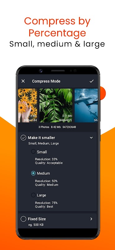 * Jadikannya lebih kecil - cara termudah untuk memampatkan foto dalam aplikasi. Anda mempunyai 3 pilihan mampatan lalai yang mengekalkan keseimbangan antara kualiti dan resolusi.