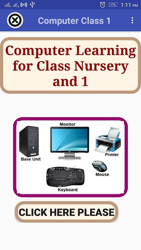 Aplikasi komputer kelas 1 (satu) sangat penting untuk pelajar komputer Kelas Semaian dan kelas 1. Ia direka untuk mempelajari bahagian komputer, Asas komputer dan Asas Komputer dengan bunyi dan animasi.