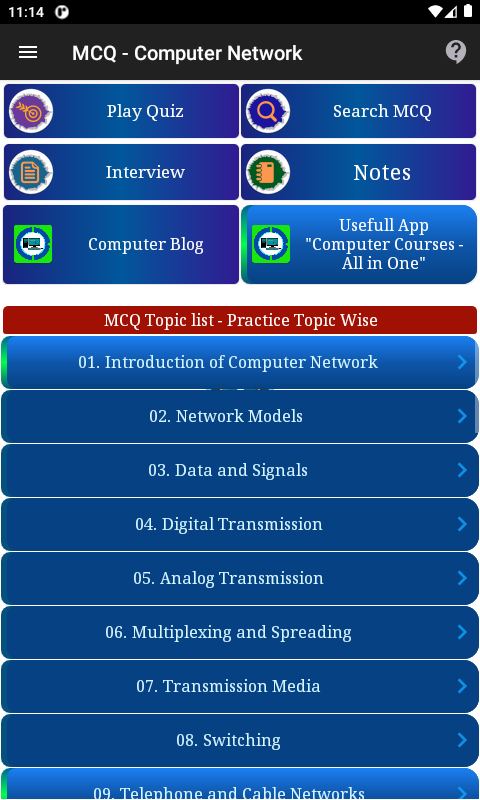 Sama ada anda seorang pelajar yang belajar untuk peperiksaan atau seorang profesional yang bersedia untuk temu duga kerja, MCQ Rangkaian Komputer, Kuiz CN, Persediaan Temuduga, CN Notes ialah alat muktamad untuk membantu anda menguasai konsep rangkaian komputer. Muat turun sekarang dan mulakan peperiksaan rangkaian anda!
