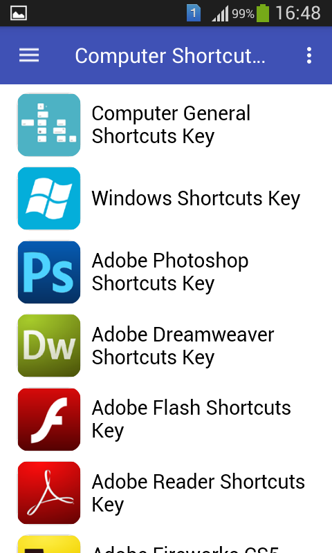 Semua PC / Komputer Shortcut Keys kod adalah Permohonan Pendidikan yang menyediakan anda pelbagai jenis kekunci pintasan helah untuk pelbagai jenis perisian, dengan bantuan aplikasi ini, anda boleh meningkatkan kelajuan kerja anda.