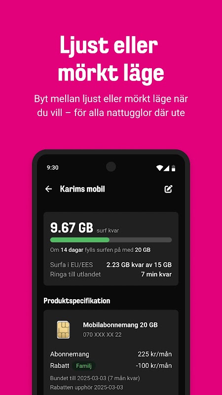 Dengan aplikasi Comviq, anda mendapat kawalan penuh ke atas telefon mudah alih. Anda boleh menukar tetapan anda dan juga membayar terus dalam apl. Cepat, mudah dan selamat.