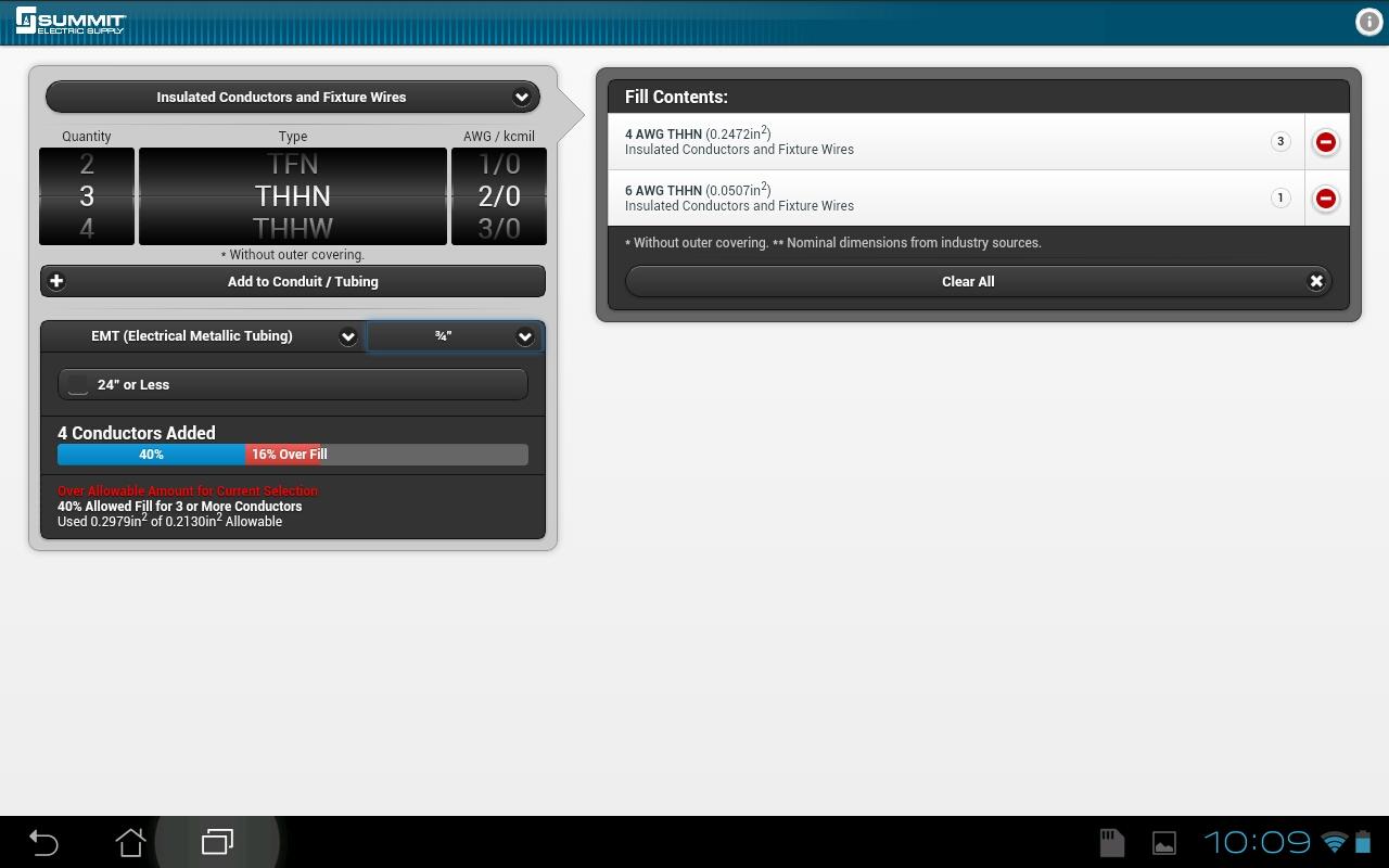 As you add and remove conductors, the app automatically calculates the permitted fill rates from the 2011 NEC, keeping you within code. Allowable fill rates adjust automatically for differences in conductor count and for conduit or tubing lengths of 24” or less.