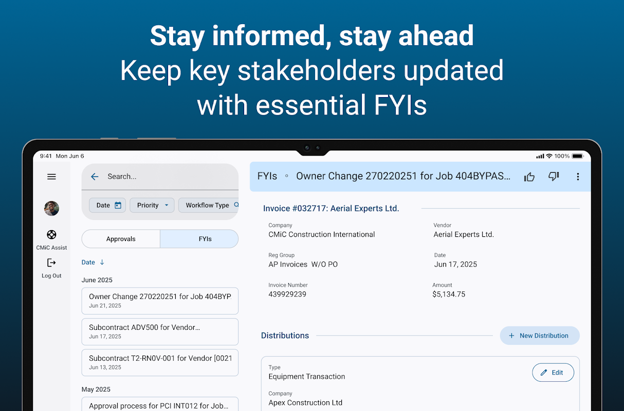 Urus pemberitahuan aliran kerja CMiC anda dan permintaan kelulusan, dan selesaikan tugas seperti melaraskan pengedaran AP Invois atau Aplikasi Bayar Subkontrak terus daripada apl!