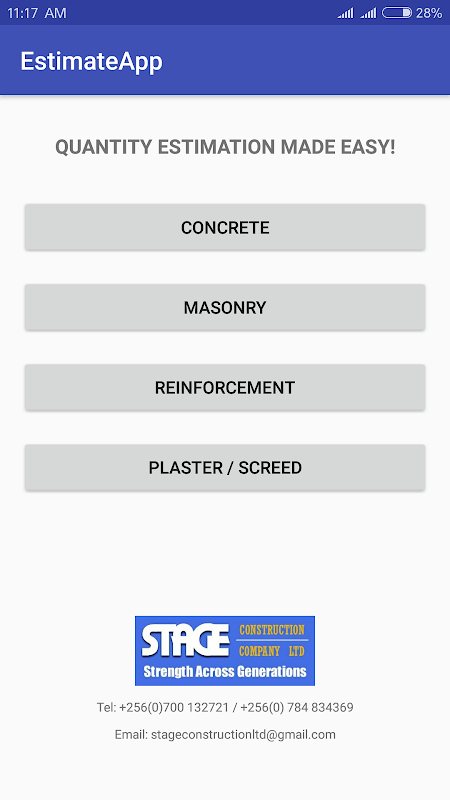 EstimateApp is a utility app that comes as a personal assistant to civil engineers, quantity surveyors, estimators, construction managers and all technical personnel in the construction industry. The general functionality of the app is centered around quantification of constituent materials for concrete, reinforcement, masonry and plaster/screed. We do understand how hectic and tedious it is to always have quantification calculations done manually and EstimateApp is here to save you the headache. In addition, EstimateApp's platform is powerful and comprehensive, yet easy to use. The developers pride themselves in creating an intuitive and easy to use interface.