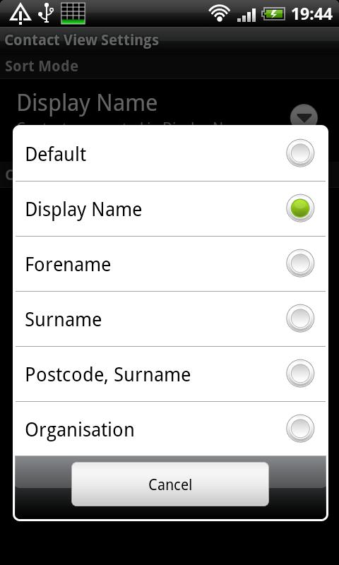 Pilihan menu baru membolehkan anda untuk menolak perintah semacam itu dari Hubungi Lookup. Anda boleh memilih untuk menyusun oleh Display Nama, nama kecil, Nama keluarga, kod Post atau Organisasi.