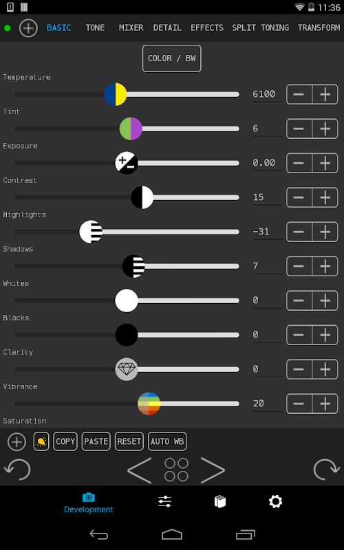• Asas, Nada, Mixer, Detail, Kesan, Split Toning, Transform dan Tentukur panel disediakan.