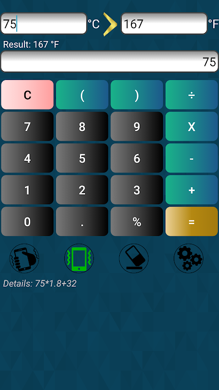 The calculator is also quiet easy to use and you have 2 ways for getting the result of your calculation, you can either press the equal button or you can shake your device if you have enabled the shake me feature and the vibrating feature so that you can feel in your hands that it has taken in consideration your shake.