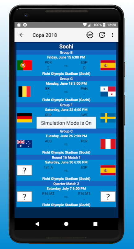 - Senaraikan perlawanan kumpulan, fasa, pasukan, tempat dan memeriksa semua perlawanan pada satu, tarikh disusun, senarai;