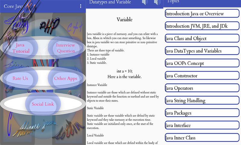 This app contains only basics which makes helps to make your foundations strong before going into deep in java.