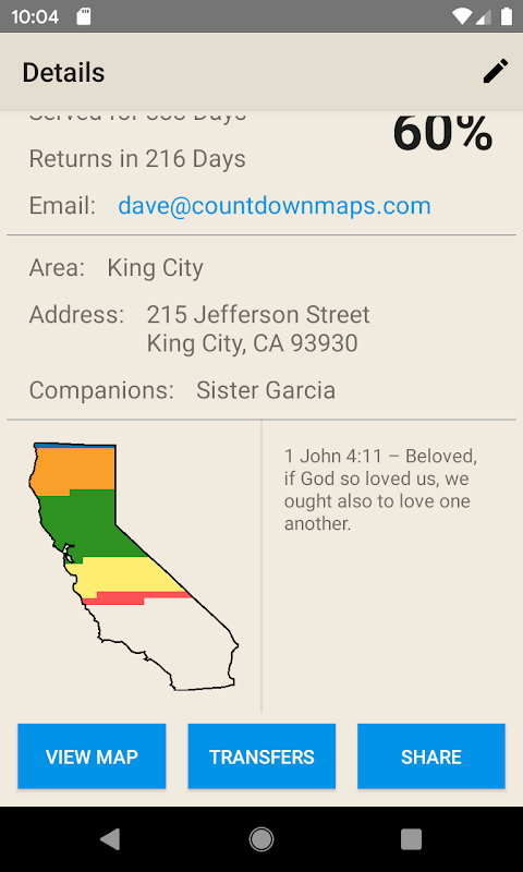 Missionary Stats - Jika anda mengetuk pada seorang mubaligh dari senarai, anda boleh melihat semua maklumat tentang dakwah yang termasuk gambar mereka, bendera negeri atau negara di mana mereka berkhidmat, hari disampaikan, hari lagi, peratus lengkap, alamat e-mel , alamat surat-menyurat, sahabat semasa (s), dan kitab atau petikan kegemaran. Alamat e-mel juga pautan terus ke email anda, supaya anda boleh memulakan e-mel kepada mereka dari pandangan ini. Anda juga boleh dimasukkan ke dalam tarikh masa depan dan ia akan undur hari sehingga mereka keluar.