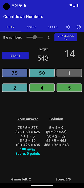 Mainkan teka-teki nombor undur mengikut masa, atau biarkan apl mencari penyelesaian kepada teka-teki yang anda sediakan. Teka-teki nombor undur memerlukan anda membuat urutan pengiraan dengan enam nombor yang keputusan akhir adalah sehampir mungkin dengan nombor sasaran rawak.