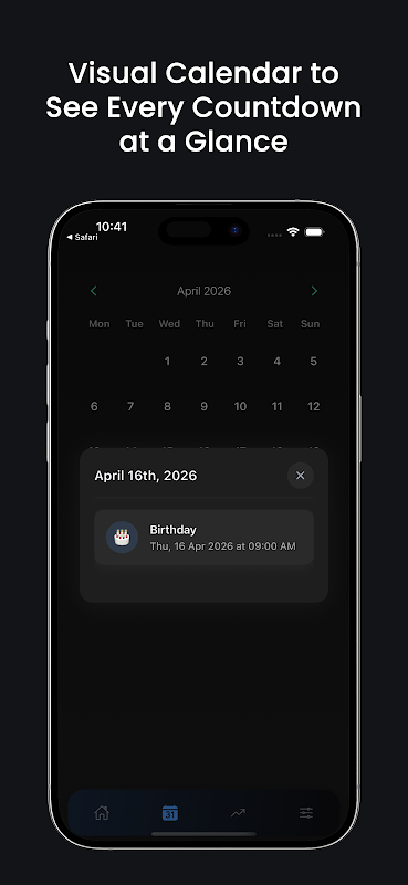 Sentiasa tahu dengan tepat berapa hari yang tinggal. Tetapkan pemasa undur, dapatkan peringatan dan kekal teratur.