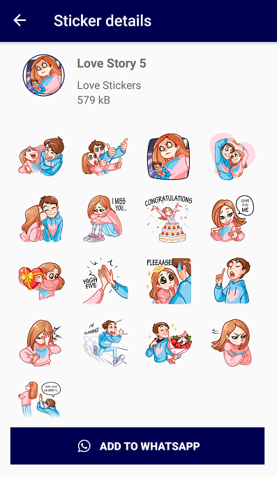 You can use couple love story stickers in WhatsApp chats. The most attractive and cool stickers have been selected for you in our mobile application. You can express your feelings more easily with these stickers. These stickers will be very useful when you get angry or you don't want to tell your loved ones. You must have the latest version of whatsapp installed on your mobile phone.