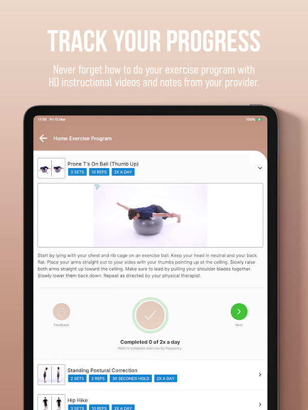 Menggunakan apl ini, anda boleh mengakses Program Senaman Rumah yang diperibadikan dengan video Arahan HD. Pada tab 'Mesej', anda boleh berkomunikasi dengan selamat dengan pembekal Program Latihan Rumah CPT anda. Semasa anda melengkapkan latihan anda, kami akan memberikan anda trofi dan pingat untuk meraikan kemajuan anda!