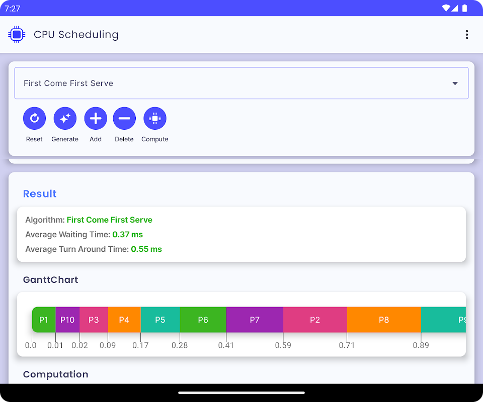 Fungsi utama aplikasi ini menyelesaikan dan graf yang berbeza algoritma CPU Scheduling. Nilai plot dalam graf bar dan ia memberi anda algoritma yang mengira purata menunggu dan pemulihan masa.