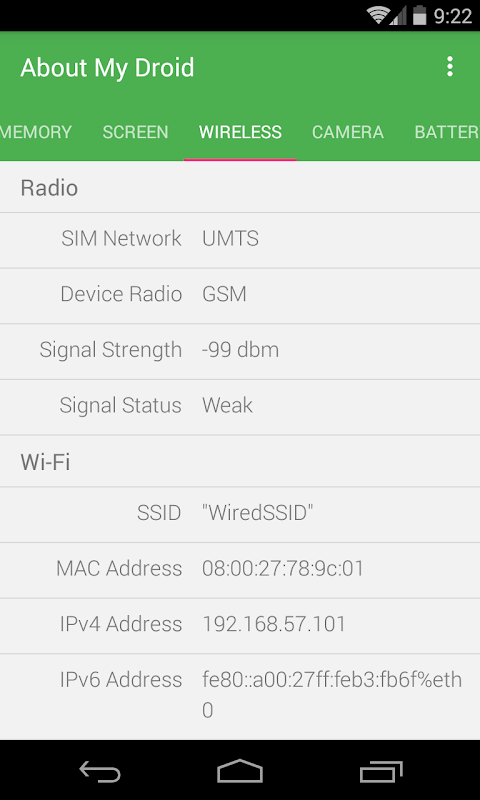 Mengenai saya Droid adalah aplikasi yang sangat cahaya wajaran yang membentangkan segala-galanya mengenai peranti Android anda termasuk sistem, CPU, skrin, penyimpanan, kamera, bateri, teknologi tanpa wayar dan sensor.