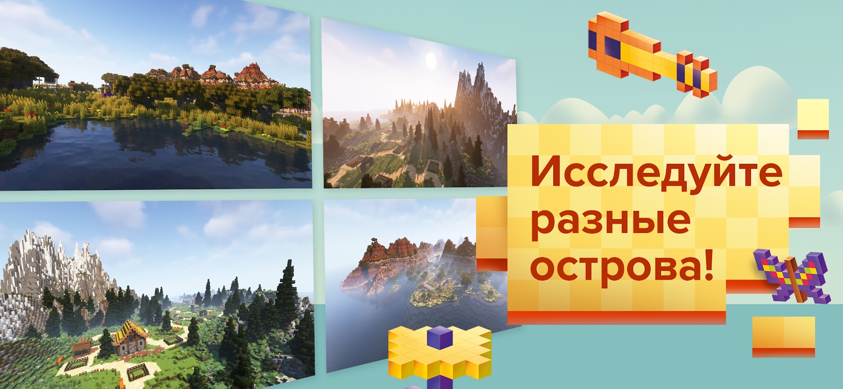 Terdapat lokasi yang berbeza di pulau-pulau kerajaan kraf: hutan, gunung, padang rumput, padang pasir, dan juga pulau bonus misteri!
