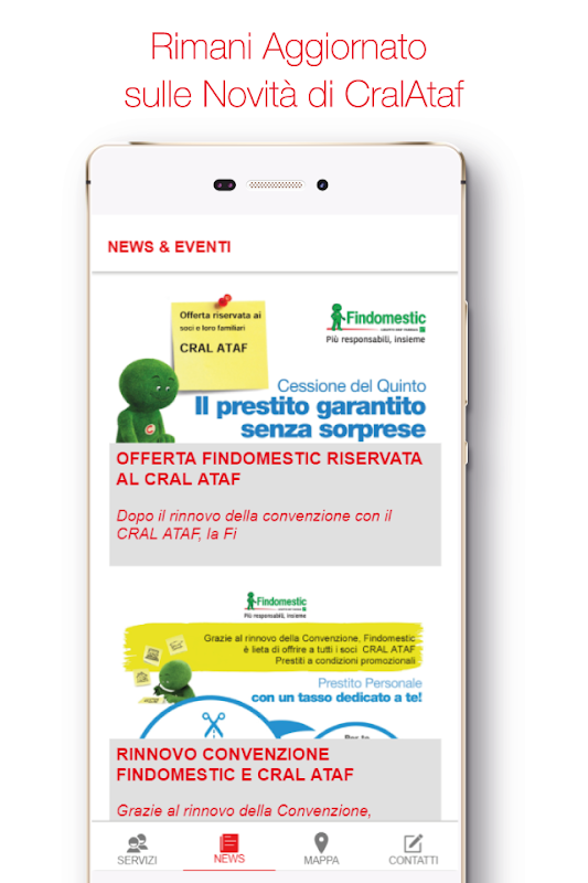 L'applicazione di Cral Ataf è stata realizzata per mostrare i servizi offerti dal circolo Ricreativo Culturale Autoferrotranvieri, aperta sia ai soci che non. Infatti, attraverso l'applicazione, sarà possibile visionare tutte le attività sociali e sportive organizzate da Cral Ataf, le convenzioni stipulate, le news e gli eventi, consultare l'archivio storico con le annesse immagini fotografiche suddivise in album . Inoltre, grazie alla possibilità di geolocalizzare direttamente in mappa la posizione delle sedi di Cral Ataf, sarà possibile ottenere le indicazioni stradali direttamente dalla propria posizione fino a raggiungere le sedi. Infine, sarà possibile contattare direttamente Cral Ataf sia attraverso un semplice form da compilare e inviare tramite e-mail oppure attraverso contatto telefonico.