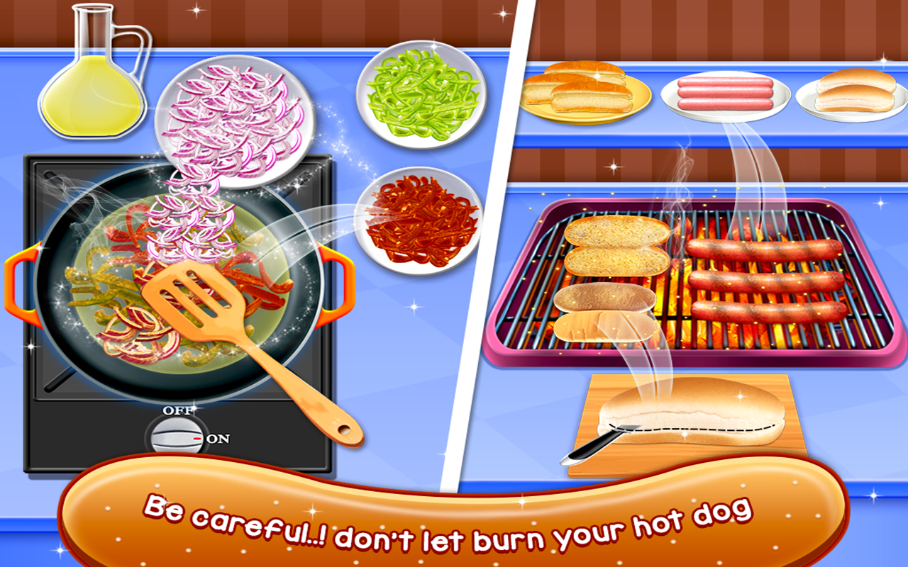Dalam permainan ini anda perlu membuat 3 jenis Hot Dog dalam trak Crazy Hot Dog anda! Anjing panas Jepun, Itali dan Amerika biasa untuk dimasak! Mula membakar sosej pada mesin gril. Berhati-hati! Jangan biarkan anjing panas anda terbakar! Sekarang letakkan sosej dalam roti hot dog dan hiaskannya dengan banyak barang hiasan. Jadikan hot dog anda lebih lazat supaya pelanggan anda akan gembira dan kembali lagi dan lagi ke trak hot dog anda! Mulakan sekarang!