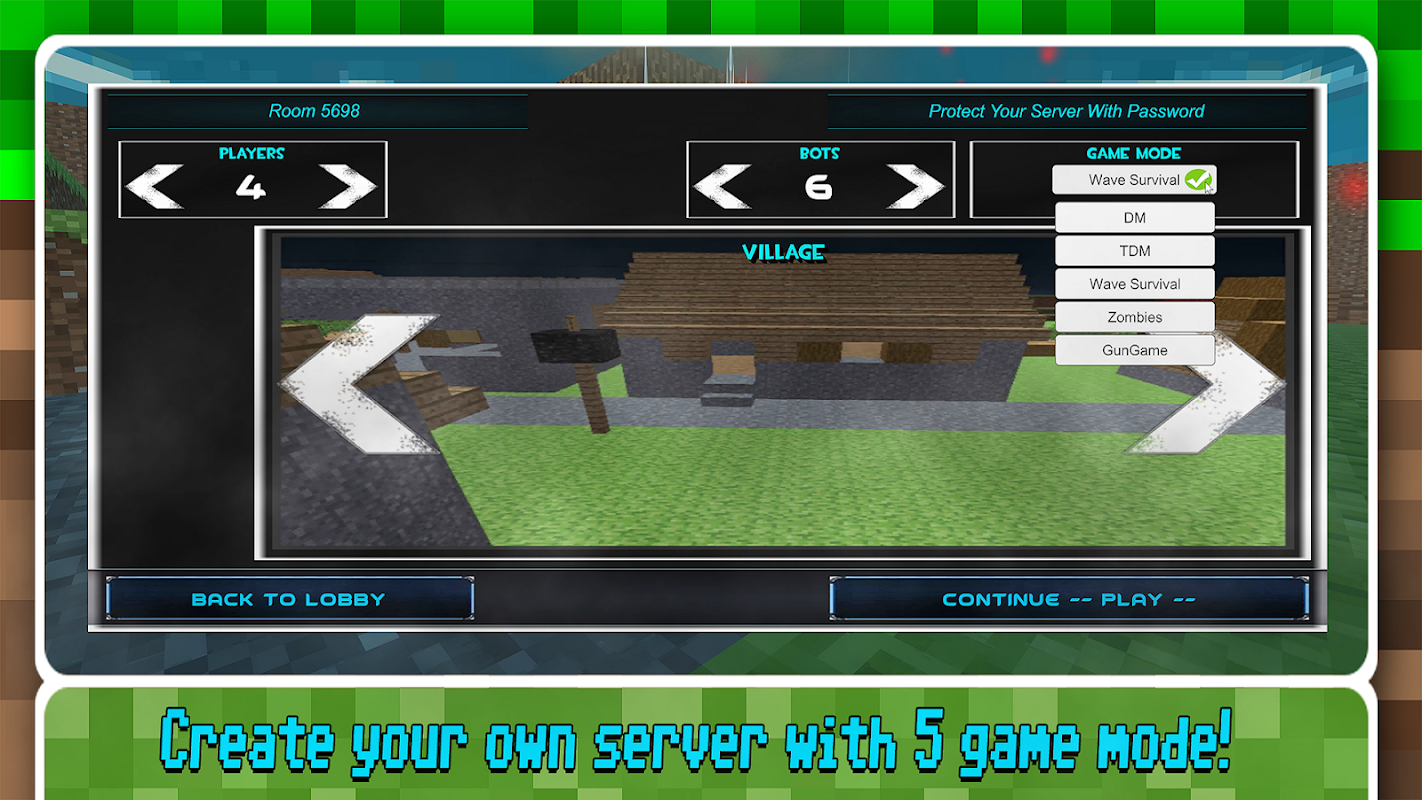 Pelancar roket, senapang sniper dan senjata automatik juga antaranya. Selain itu, jangan terlepas pandang utiliti jarak rendah senjata api jarak dekat anda. Selamat mencuba, dan saya doakan anda berjaya! Dalam Gungame Pixel berbilang pemain, mengawal watak dan menghadapi Ai dan lawan manusia adalah mudah. Protagonis hebat dalam permainan video penembak tempur, lengkap dengan arena yang dipenuhi asap dan gerombolan musuh (termasuk tentera manusia dan zombi) untuk dihapuskan. Dunia piksel 3D sangat realistik. Lima mod berbilang pemain tersedia: GunGame, Survival Wave Zombie, Pasukan vs Pasukan, Anda sebagai Zombie lawan Semua Pemain dan Ai Musuh, dan Percuma untuk Semua. MODEL 24 SENJATA BERPIKSELA. - 1 peta. Nilai jualan utama penembak orang pertama pemain tunggal ialah 40 TAHAP MENAKJUBKAN. - beberapa peringkat mempunyai gelombang musuh zombie yang berbeza-beza yang bertelur pada masa dan lokasi rawak, bergantung pada peta dan senjata. Permainan menembak arena 3D percuma yang dibintangi oleh pistol berhalangan, boleh dimainkan pada telefon dan peranti Android.