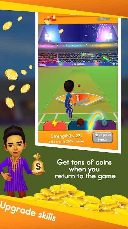 Anda perlu mencari masa terbaik dan memukul bola kriket anda sejauh mungkin. Lebih jauh anda boleh memukul, lebih banyak syiling dan berlian yang anda boleh dapatkan. Jangan lupa untuk meningkatkan kemahiran anda dan buka kunci barangan menarik! Sekarang, dapatkan sudut yang sempurna dan buat bantahan hebat!