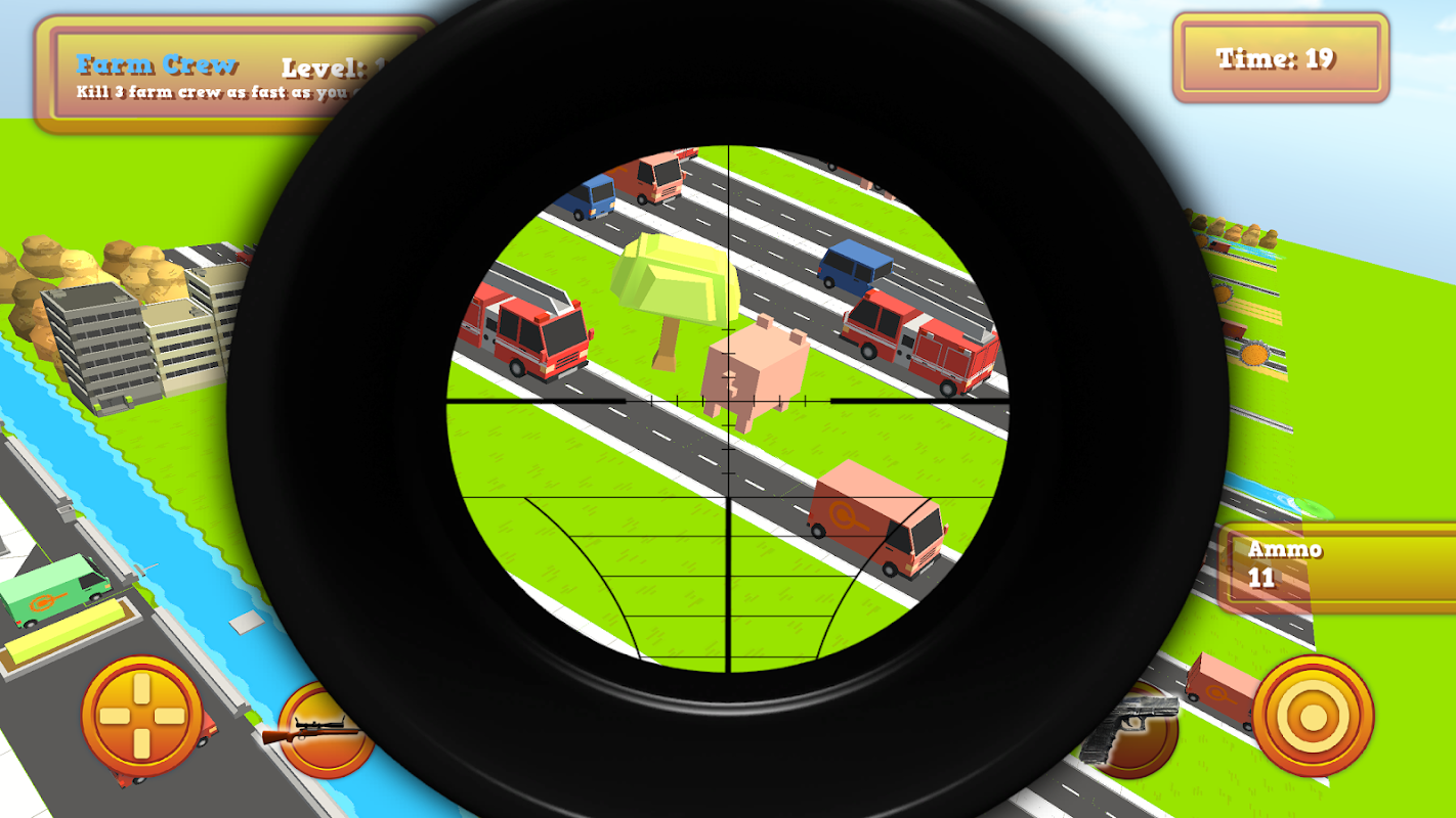 Those pesky rabbits, cats, pigs and ducks are trying to get into the city. Can you take them out before they manage to cross the road into the city? You have a vast array of weaponry! Use them wisely. They can be hit by cars too, so that might make it a little easier for you.