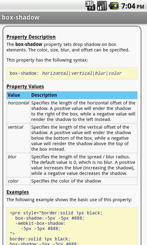 The CSS properties are categorized and searchable. Each property information screen contains a property description, values the property accepts, examples, browser compatibility, and version information. In addition, some properties include the display results of the various property values (e.g. border styles, text decoration, etc.).