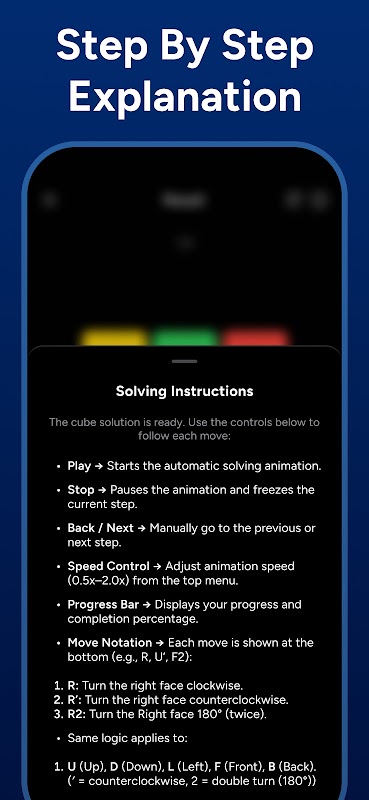 Tonton penyelesaian anda terungkap mengikut kadar pilihan anda. Perlahankan animasi untuk mempelajari logik di sebalik setiap pusingan, atau mempercepatkannya apabila anda hanya memerlukan rujukan pantas. Selepas panduan berpandu, apl mencipta pecahan penuh supaya anda boleh menyemak kaedah lengkap dan mengulangi pergerakan dengan yakin.