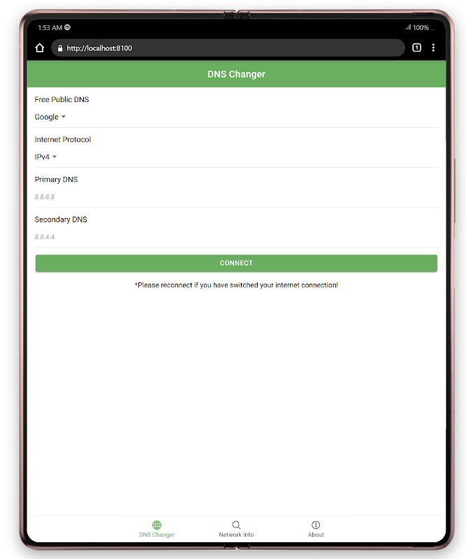 DNS tersuai ialah penukar DNS yang mudah digunakan yang menyokong kedua-dua IPv4 dan IPv6. Ia berfungsi pada kedua-dua rangkaian Wi-Fi dan mudah alih, dan anda tidak perlu mengakar telefon anda.