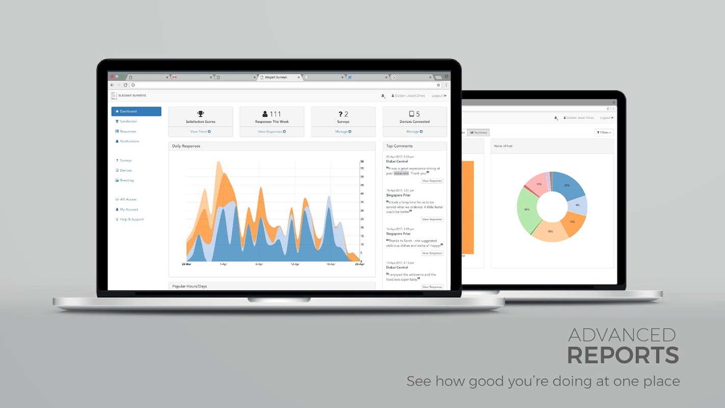 Cloud papan pemuka dengan laporan grafik, analisis data dan isyarat untuk mengesan kepuasan pelanggan dan sentimen. Digunakan di seluruh dunia oleh restoran, salun, butik, peruncit, hospital, farmasi dan lain-lain untuk mendapatkan maklum balas pelanggan.