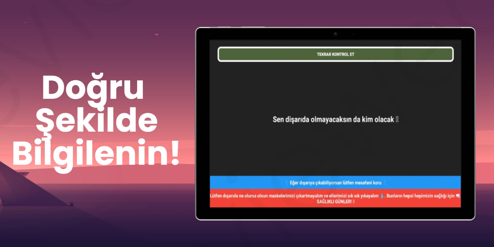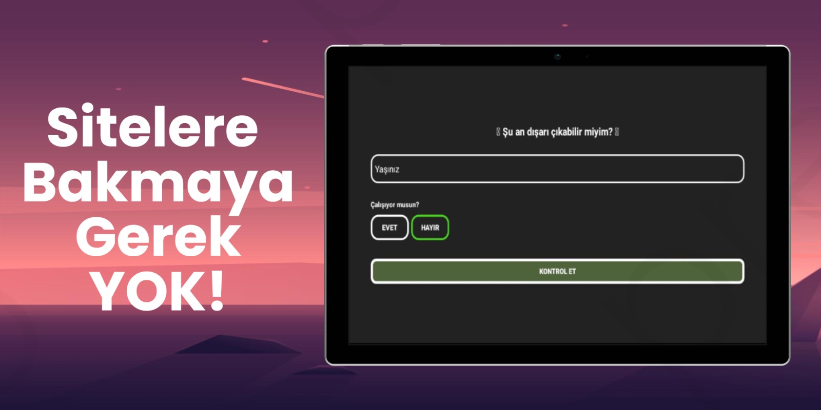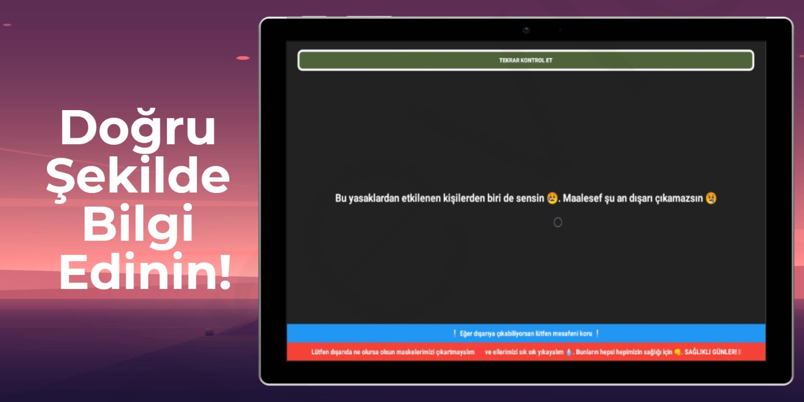Dışarı Çıkabilir Miyim? uygulaması o an bulunduğunuz güncel zamana göre size dışarı çıkıp çıkamayacağınızın bilgisini verir. Bu günlerde hepimizin "Bu ne ya ben hiçbir şey anlamadım" dediğini hissettiğim ve en başta benim de kafam karıştığı için bu şekilde bir uygulama yaptım :)