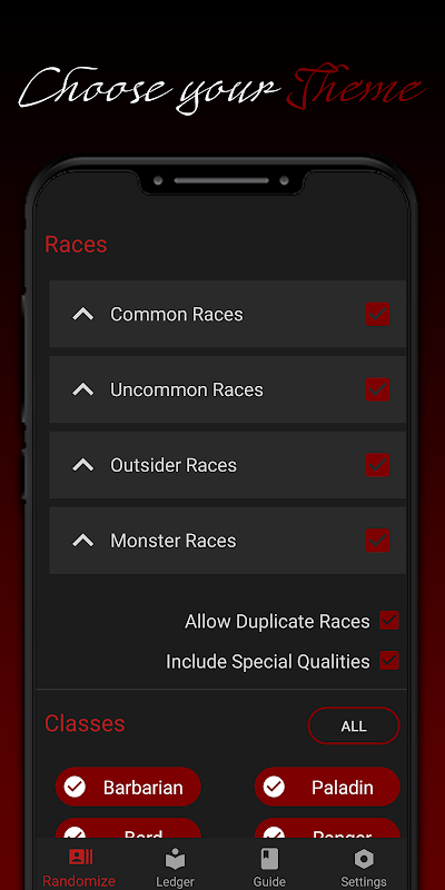 Langsung dari bahan sumber Wizards of the Coast kami merangkumi perlumbaan, kelas, subkelas, skor kemampuan, dan latar belakang watak anda. D&D Genesis juga menampilkan keunikan bagi watak ketika membentuk pesta sehingga tidak ada dua anggota parti yang harus sama kelas atau bangsa.