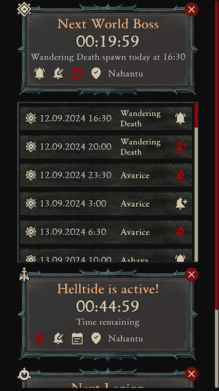 "D4 Events Time Tracker" menawarkan antara muka mesra pengguna dan navigasi mudah supaya anda boleh fokus pada permainan. Ciri penting ialah penyesuaian pemberitahuan, yang akan dihantar ke peranti anda sebelum permulaan setiap acara (Bos Dunia, Helltides, Legions). Ini bermakna anda sentiasa boleh log masuk ke permainan tepat pada masanya dan bersedia.