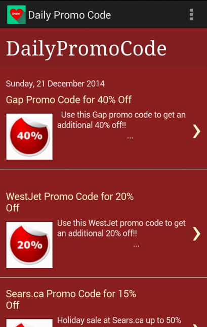 Daily Coupon Code delivers a new FREE coupon codes to you every single day! Stay in the loop with the best new online coupon codes. Save money using the daily feature coupon codes or explore a host of previously featured coupons to save even more! You can easily share your favorite deals on multiple social networks with friends and family. This app will be your go-to mobile hub for the hottest new FREE coupon codes! Daily Coupon Code is a 100% free service, available worldwide, in the Google Play Store.