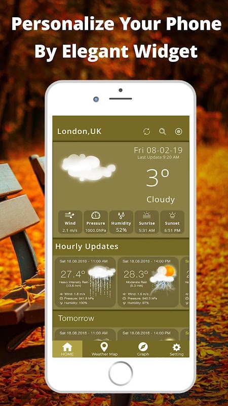 ☀️ This daily weather app weather tracker display current temperature, daily and hourly forecasts, sunrise and sunset time, humidity, wind speed and air pressure with weather today & weather tomorrow.