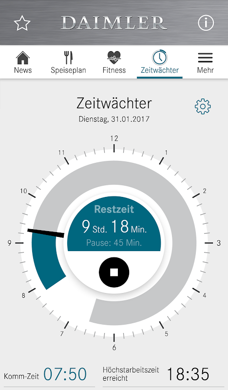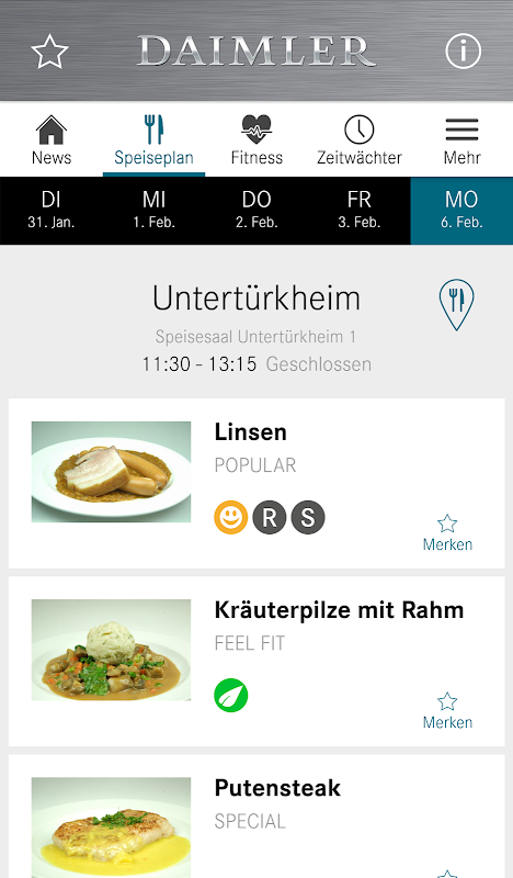 Zeitgleich mit der Veröffentlichung im Intranet versorgt Sie Daimler 4You mit den aktuellen Unternehmensnachrichten. Für Ihre ganz persönliche Nachrichtenübersicht können Sie sich die verschiedenen Kanäle, die Sie aus dem Mitarbeiterportal kennen, nach Ihren Interessen individuell zusammenstellen. Mit Daimler4You haben Sie die Speisepläne und Öffnungszeiten der Kantinen immer mobil dabei. Außerdem eingebaut: Der Zeitwächter, der Sie bei der Einhaltung der 10-Stunden-Regel unterstützt, Infos zum Angebot der Gesundheitszentren, die Entgeltuhr, die Sie über den nächsten Gehaltslauf informiert sowie Links zum mobilen Mitarbeiter-Portal, Firmenangehörigengeschäft und zu den Mitarbeiterangeboten. Ebenso individuell konfigurierbar: Die Schnellnavigation.