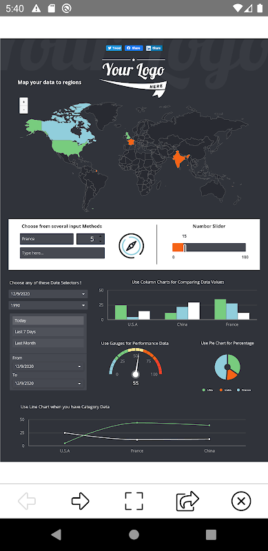 Dengan ClicData untuk Android, setiap pengguna ClicData boleh mengakses papan pemuka mereka dan melaporkan dengan lancar pada tablet atau telefon mudah alih mereka untuk tetap up to date dengan maklumat terkini dari perniagaan mereka.
