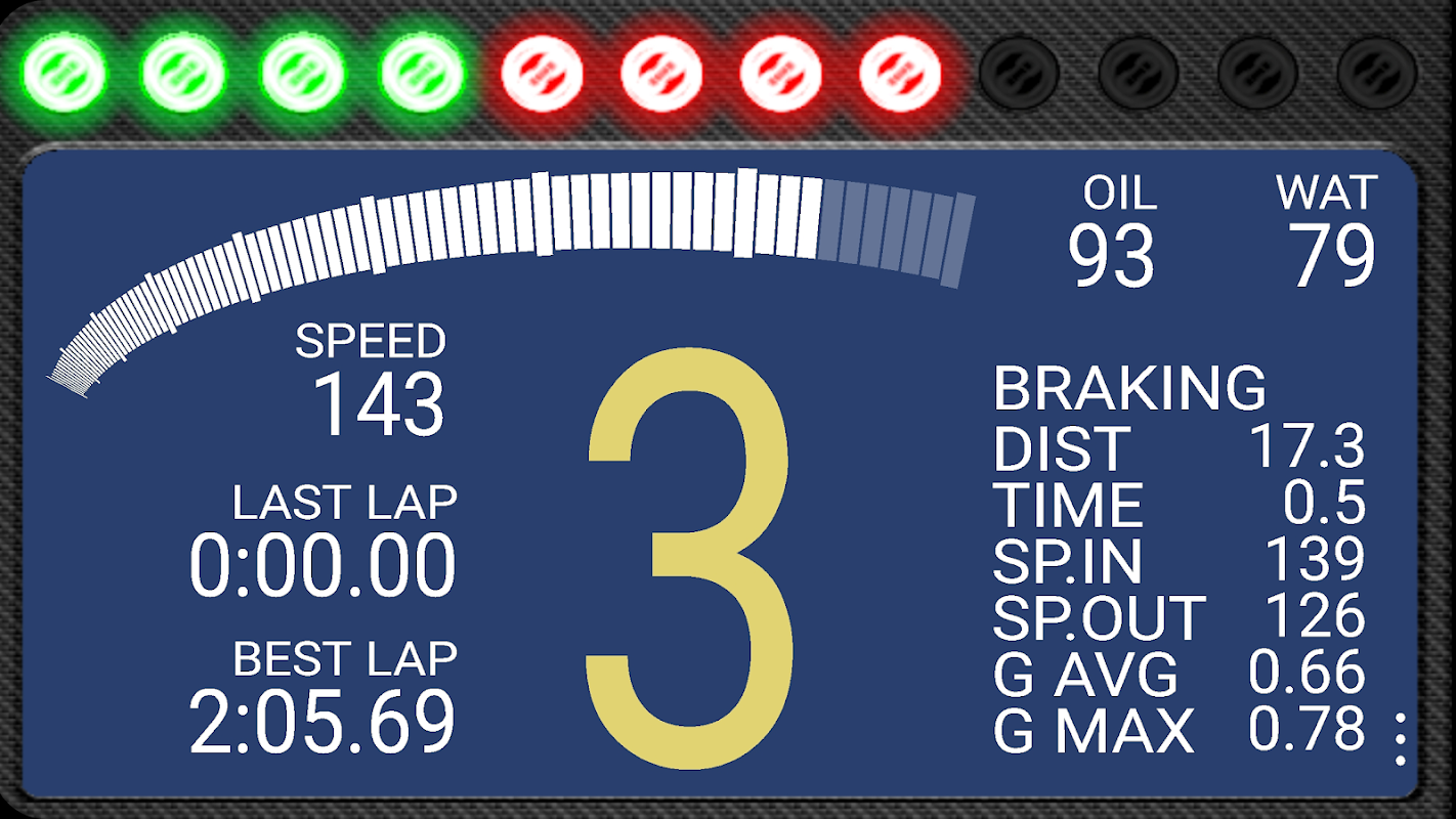 - Braking Statistics: Distance, time, speed in/out, G-force avg/max.
