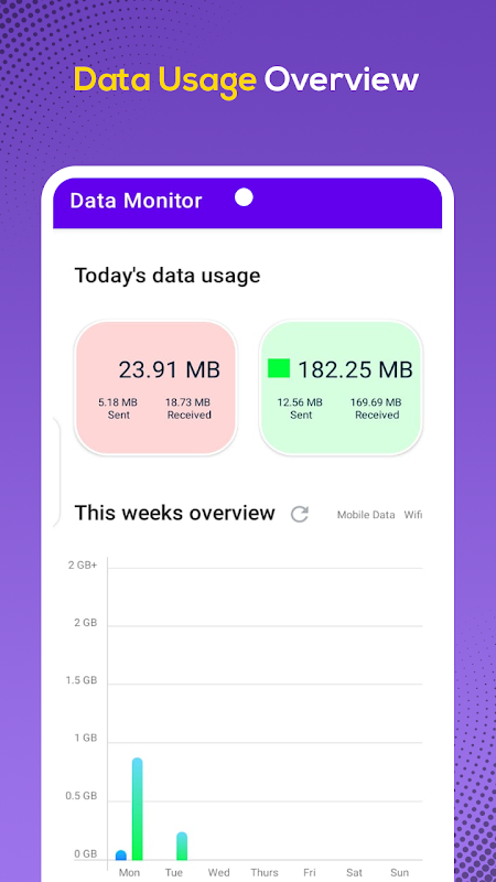 • Internet speed meter monitors mobile Data Usage and Wi-Fi Data Usage, giving different options for setting usage alerts.