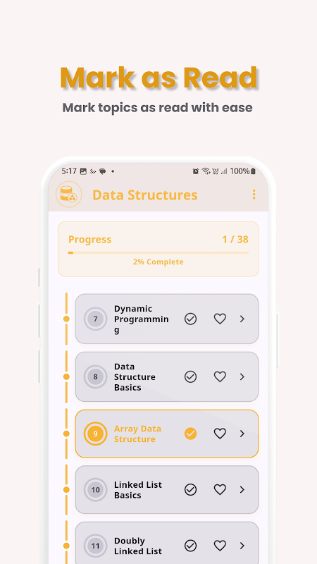 Struktur Data ialah cara terprogram untuk mengatur data supaya ia boleh digunakan dengan cekap. Apl ini membantu pelajar dan profesional membina intuisi yang kuat dengan bab berstruktur, contoh yang jelas dan penerangan berorientasikan amalan. Ciri baharu termasuk Kegemaran untuk akses pantas kepada topik yang kerap digunakan dan Tandai sebagai Baca untuk menjejak kemajuan pembelajaran merentas bab.