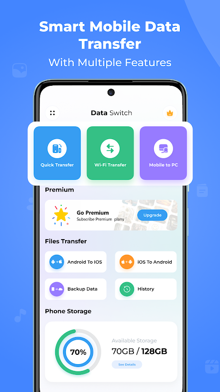 Phone clone data transfer app utilizes all types of file formats. Smart Phone transfer app backup all the content of Android. Fast phone clone- a data sharing app is beneficial to copy my data content transfer app that moves all the data from one device to another. Using a smart Data transfer simplifies the process of transferring data from one device to another. You can use the Transfer My Data app for easy transfer between smart phones. Effortlessly transfer all data to your device with the Smart Data Transfer- phone clone app.