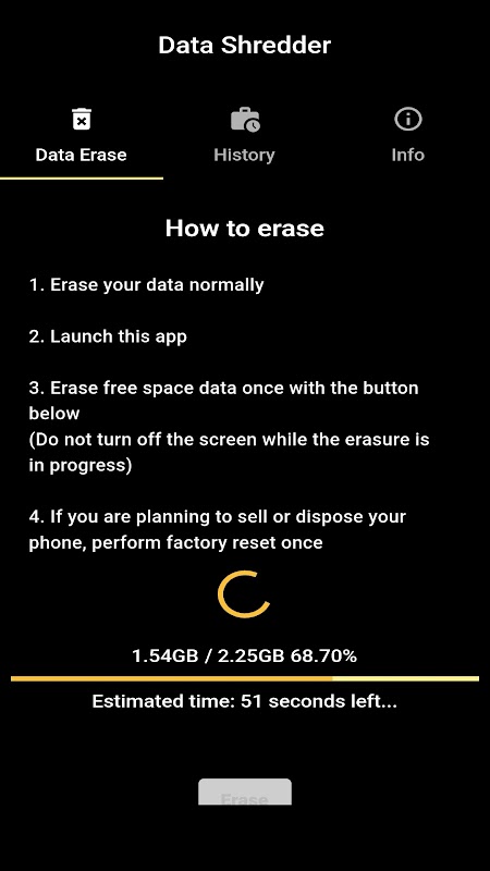 Jika Anda khawatir tentang data pribadi Anda di penyimpanan saat Anda membuang atau menjual ponsel Anda, aplikasi ini cocok untuk Anda. Sekalipun Anda menghapus berkas dari ponsel, data Anda mungkin masih ada di ruang penyimpanan kosong Anda. Aplikasi ini bekerja dengan mengisi ruang kosong dengan data yang tidak berarti sehingga data pribadi Anda tidak tertinggal. Gunakan aplikasi ini sebelum Anda membuang ponsel Anda.
