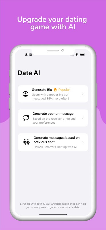 Tetapi bukan itu sahaja - Date AI juga menghilangkan tekanan dalam mencipta mesej pertama yang sempurna. Cuma muat naik tangkapan skrin profil perlawanan anda dan apl kami akan menganalisis minat, keutamaan dan data lain mereka untuk menjana mesej yang disesuaikan dengan profil unik mereka. Ini meningkatkan peluang perbualan yang berjaya dan potensi perlawanan.