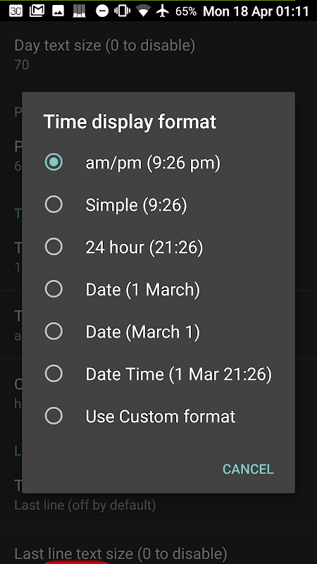 Paparan boleh memberi hanya hari dalam seminggu dan tempoh hari. Terdapat juga pilihan untuk memaparkan masa dan / atau tarikh sebenar jika diperlukan.