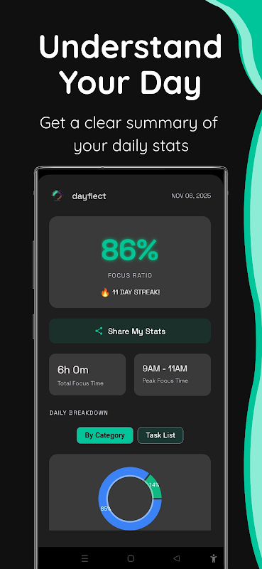 Alami jadual anda dengan cara yang baharu. Dail hari bulat menukar masa anda menjadi garis masa visual yang indah. Setiap segmen tugasan bersinar lebih cerah apabila Nisbah Fokus anda bertambah baik, memberikan anda maklum balas segera.