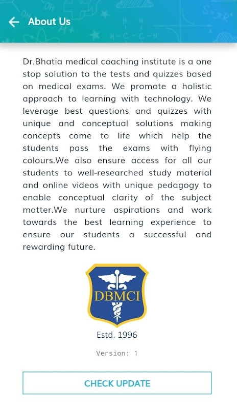 Dr.Bhatia medical coaching institute is a one stop solution to the tests and quizzes based on medical exams. We promote a holistic approach to learning with technology. We leverage best questions and quizzes with unique and conceptual solutions making concepts come to life which help the students pass the exams with flying colours.We also ensure access for all our students to well-researched study material and online videos with unique pedagogy to enable conceptual clarity of the subject matter.We nurture aspirations and work towards the best learning experience to ensure our students a successful and rewarding future.