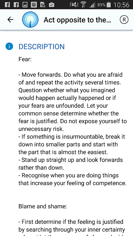 Aplikasi ini mengandungi penerangan terperinci, tips amalan dan rasional berdasarkan kemahiran yang digunakan dalam Terapi Kelakuan dialektik, yang telah terbukti sangat berkesan dalam membantu orang dengan pelbagai kesukaran - khususnya kerana tumpuannya terhadap pembelajaran kemahiran yang berkesan. Kemahiran dibahagikan kepada enam modul: Kesedaran, Kemahiran Interpersonal, Emosi Peraturan, Distress Toleransi, Pengesahan, dan Penyelesaian Masalah. Fungsi aplikasi yang dibangunkan untuk mengukuhkan pembelajaran dan meningkatkan akses kepada kemahiran, sekali gus membantu pembangunan tingkah laku yang berkesan.